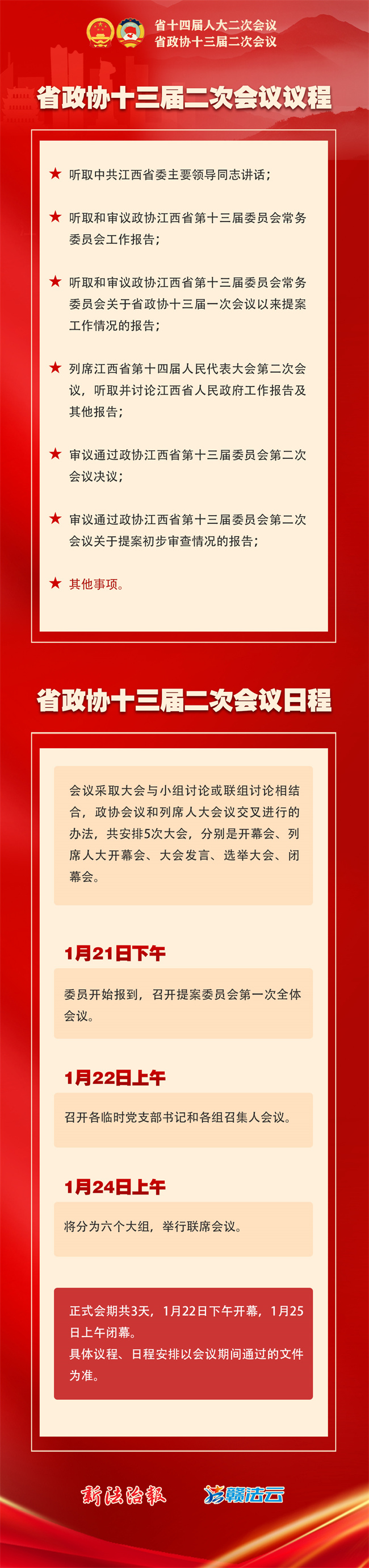 据了解,本次会议日程安排为:1月21日下午委员开始报到,召开提案委员会第一次全体会议;1月22日上午召开各临时党支部书记和各组召集人会议。正式会期共3天,1月22日14时30分开幕,1月25日上午闭幕。据悉,1月24日将召开联组会议,分别围绕“深化落实产业链现代化建设‘1269’行动计划”“把农业产业化作为关键抓手,深入推进乡村全面振兴”“打好蓝天、碧水、净土提升攻坚战,推动打造国家生态文明建设高地”“增强基层治理效能,构建现代化社会治理体系”“进一步推进教育、科技、人才协同融合发展”“繁荣发展赣鄱优秀文化,推进文化强省建设”进行协商议政、凝聚共识。
