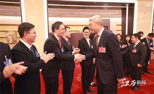 尹弘、叶建春与工作人员一一握手,感谢大家付出的辛勤努力。尹弘说,人民代表大会制度是坚持党的领导、人民当家作主、依法治国有机统一的根本政治制度安排。每年召开全国人民代表大会,是践行全过程人民民主的具体体现。十四届全国人大三次会议即将胜利闭幕,会议期间,江西代表团各位代表认真履职尽责,严谨细致审议大会各项报告,提出许多高质量议案建议,顺利完成大会各项任务,这与代表团全体工作人员的共同努力和保障服务密不可分。大家始终以饱满的政治热情和认真负责的工作态度,恪尽职守、紧密配合,严格遵守会风会纪,加强各环节沟通协调,扎实做好会务组织、新闻报道、材料简报、后勤服务、安全保障、卫生保健等各项工作,充分展现了江西代表团优良的工作作风、严格的质量标准。
