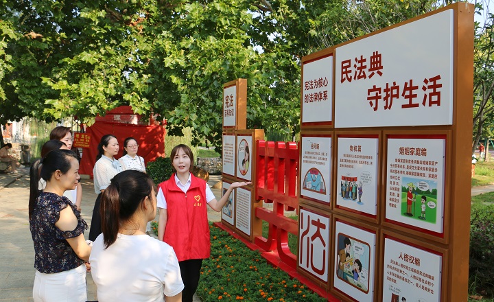 宪法主题公园地处义峰风光带与城市文体轴交会处,依偎在博阳河畔,是德安县为扎实开展全民法治宣传教育而打造的重要法治文化阵地。公园内,法治元素与自然景观交相辉映,错落分布着多块造型各异的宣传牌,内容涵盖宪法精神、民法典常识、反诈警示等,市民可在休闲健身的同时驻足学习,勾勒出一幅“景中见法、法润人心”的温情画面。