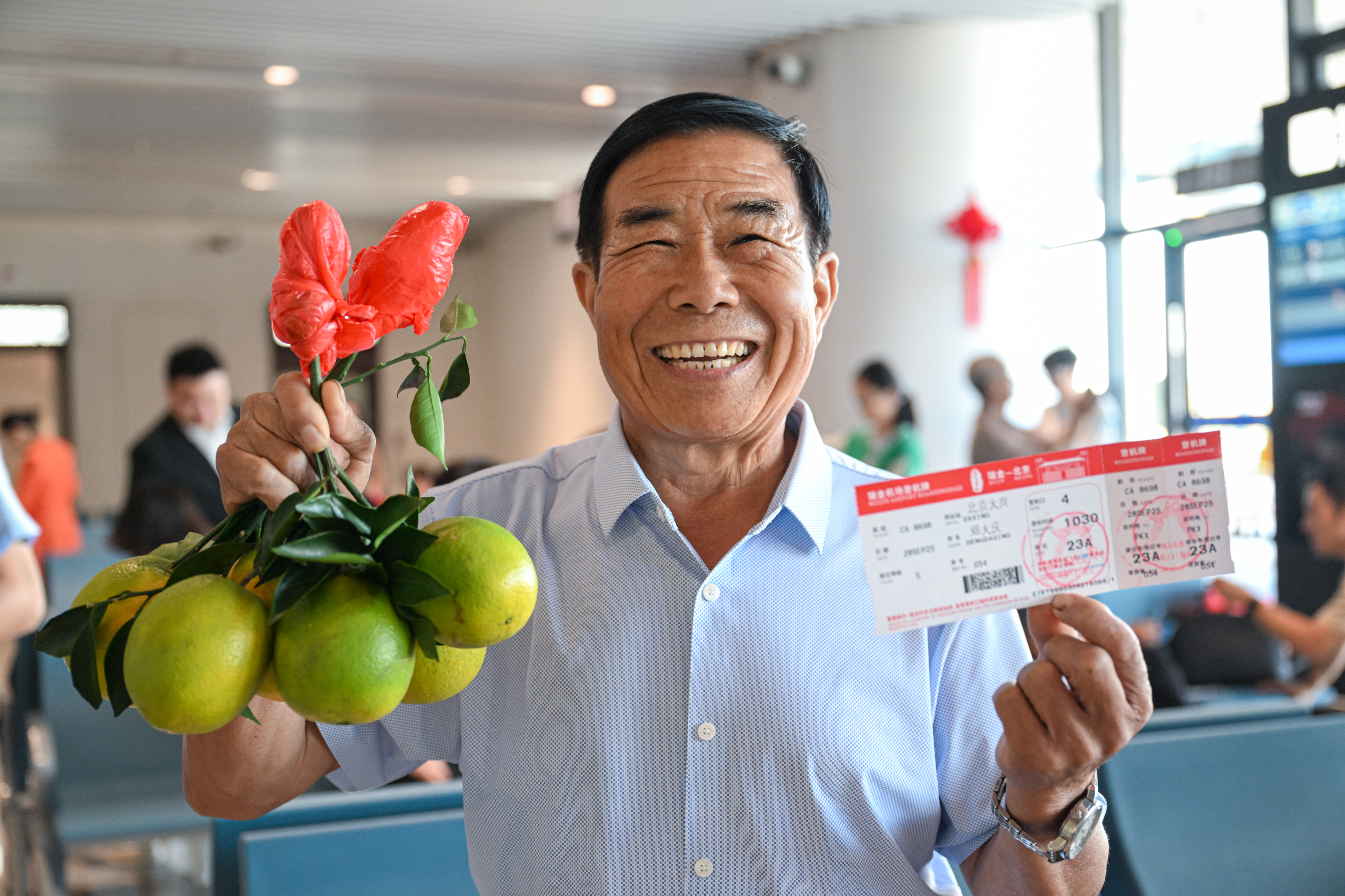 乘客刘春明怀揣着爷爷的照片坐上了首趟瑞金飞往北京的航班。他的爷爷刘家祁是老红军。为了完成爷爷的心愿,他带上爷爷的照片抵京。在中国人民抗日战争纪念馆前,他手持爷爷的照片,拍下了一张跨越时空的“合影”。他感慨道:“这趟来得值——既圆了爷爷的心愿,也让我更深刻地认识到今天的幸福生活来之不易,中华民族伟大复兴必将实现。”