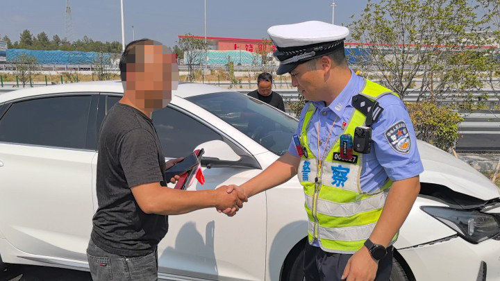 10月8日上午,沪昆高速公路555km处发生三车追尾事故。江西省公安厅交管总队高速交警五支队第五大队民警引导事故车前往服务区处理时,发现黄某某被“遗忘”在高速公路上。民警一路追赶10公里,在上饶服务区将黄某某送回其家人的车上。黄某某对民警的帮助一再表示感谢。