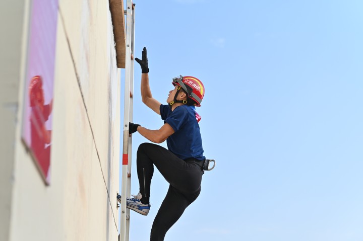 爬绳上4楼、用无齿锯切灯泡上的铁丝、将5个乒乓球转移到5个瓶口,在这一连串的操作考核中,来自鹰潭市消防救援支队梅枫路特勤站的孔令昂获得第一名。