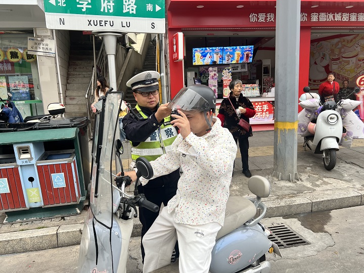 11月13日一大早,蔡风林便赶到了与学府路相邻的抚州市第一中学和临川区第四中学路段,开展早巡工作。“这位同学,把头盔戴好。”“这位家长,怎么只有你戴着头盔,孩子的安全不管吗?”蔡风林一旦发现未按规定佩戴安全头盔的情况,便会及时予以提醒。