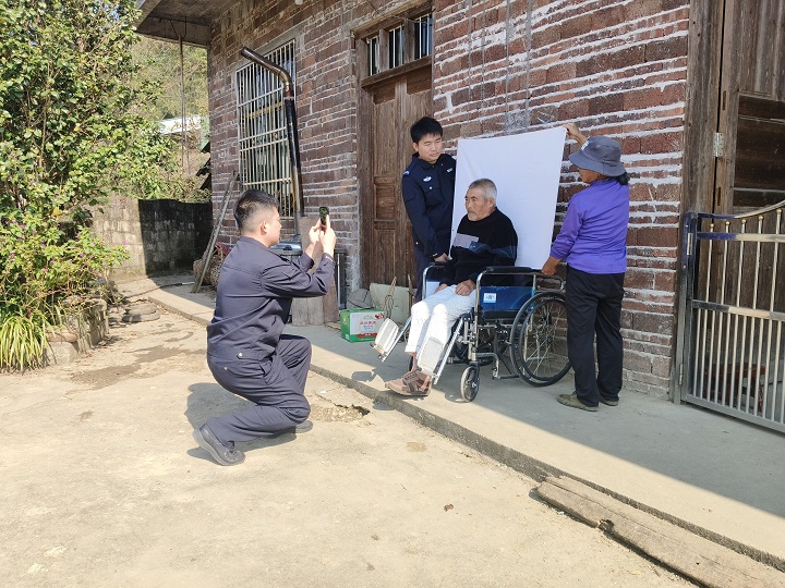 11月17日,遂川县公安局大汾派出所的户籍民警黄玲与网格村警曾海燕来到螺汾村廖祥寅老人家中,为其提供上门拍照办证服务。