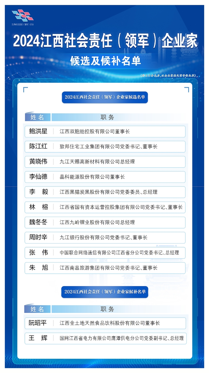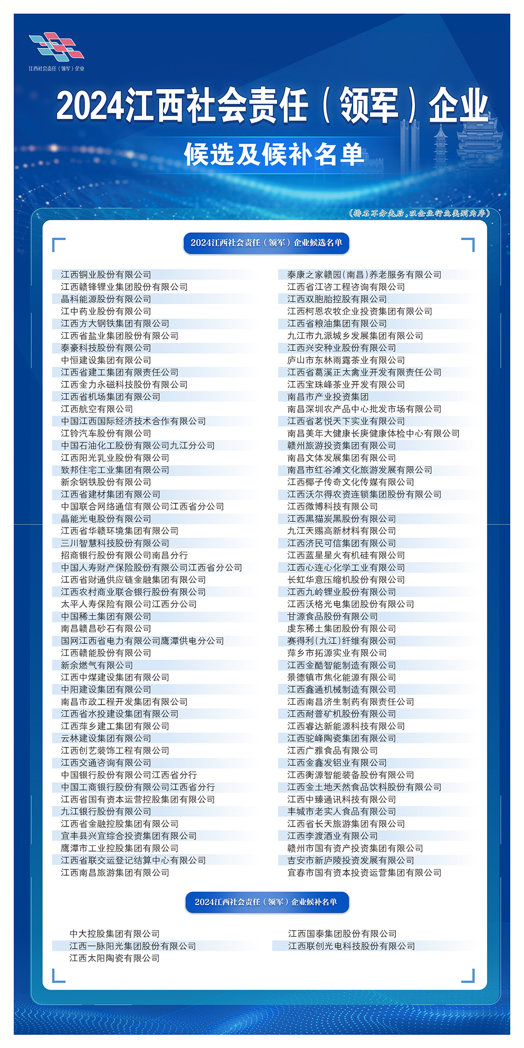2024江西社会责任(领军)企业(企业家)候选及候补名单今日起公示