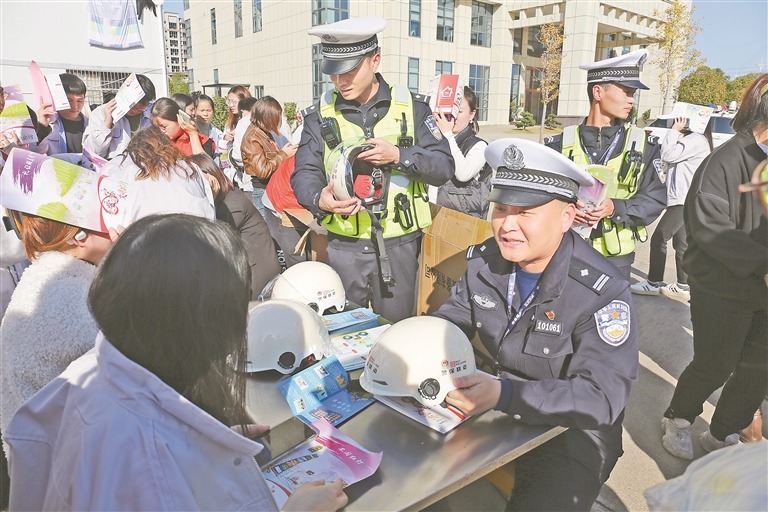 李俊(右一)宣讲交通安全知识(图/受访者提供)