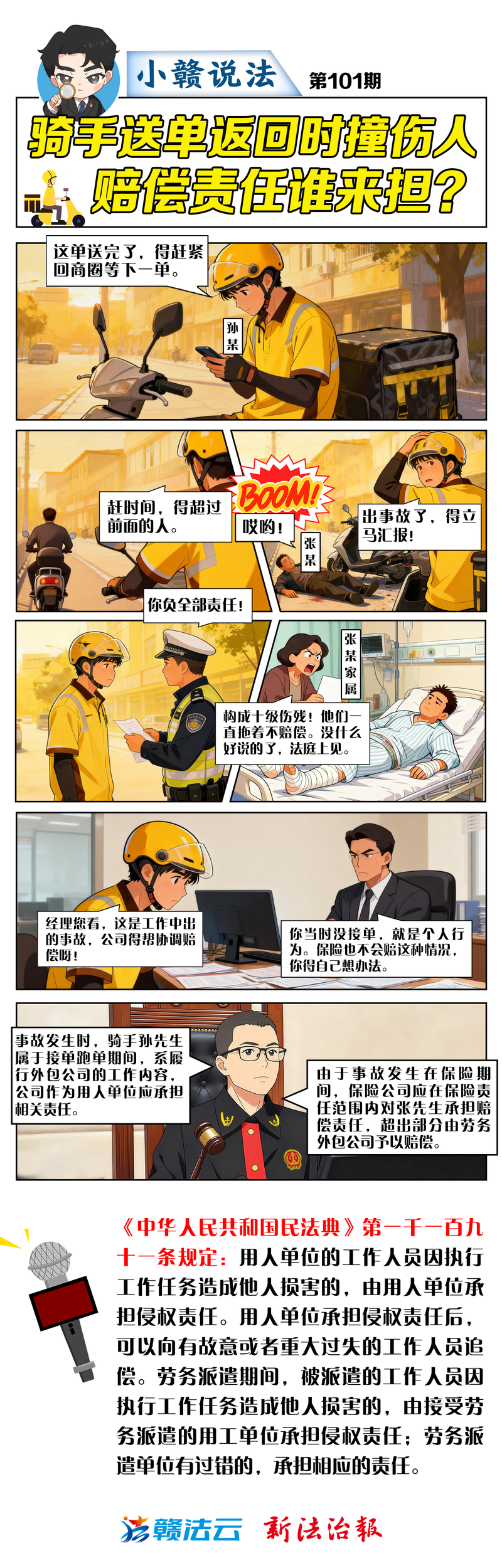 骑手送单返回时撞伤人,赔偿责任谁来担?