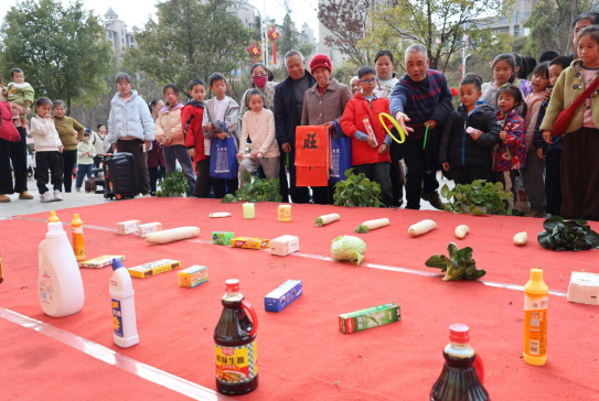 猜灯谜与套圈互动区同样热闹非凡,灯谜涵盖民俗常识、生活常识等多方面内容,简单有趣又兼具知识性,吸引了各年龄段居民驻足参与。大家围在灯谜前,或独自凝神思索,或三五成群相互探讨,不时交流思路、分享答案,脸上满是专注与笑意。猜对的居民可以获得套圈机会,他们拿着套圈满怀期待地走向礼品区,瞄准心仪的小礼品轻轻一抛,欢呼声、喝彩声此起彼伏。一个个小小的套圈,不仅套出了新春的乐趣,更套出了居民们的欢乐与喜悦,让大家在游戏中感受浓浓的节日氛围。