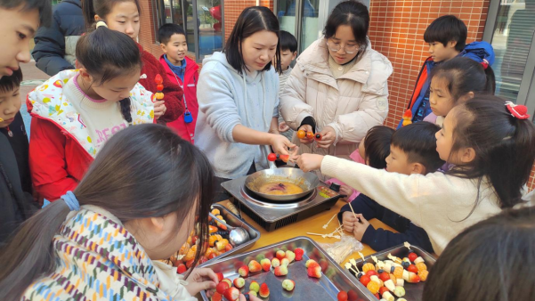 理论讲解结束后,动手环节正式开始,孩子们化身“小小传承人”。社区与托管人员分工协作,现场指导,紧盯安全。孩子们挑选水果、串制果串,搭配出“新春串”等。熬制好的糖浆热气腾腾,孩子们在托管人员的引导下有序排队,将果串浸入糖液,托管人员全程提醒孩子们注意防烫,守护每一个孩子的安全,浓郁的甜香弥漫整个现场。