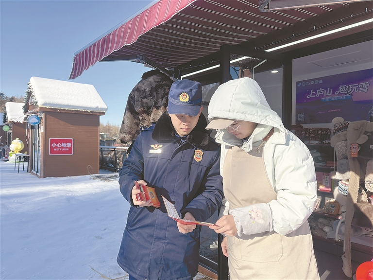 11时许,牯岭镇上的雪越下越大,消防员洪聪、罗世豪等人归队后,立即换上红马甲,变身“蓝焰红心”志愿(便民)服务分队队员,在游客密集的庐山索道广场、景区入口售票处、缆车进出口设立执勤点,有序疏导游客,维持现场秩序,防止踩踏等事故发生。