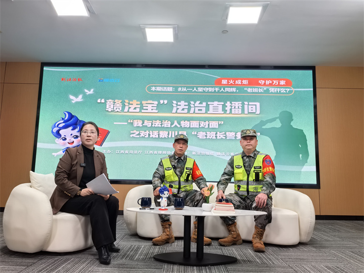 2月27日20时,“赣法宝”法治直播间准时开播。在“我与法治人物面对面”的镜头里,2025年江西省“年度法治人物”——黎川县“老班长警务队”队长王志刚、队员李文明并肩而坐,红色袖章在灯下泛着微光。共计56.3万人收看了这场直播。