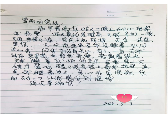 3月9日上午,一封特殊的手写感谢信被送到了江西省妇幼保健院九龙湖院区急诊科,信纸不算精致,字迹也因书写者身体虚弱而略显潦草,却字字滚烫、句句真诚,成为春日里急诊科最温暖的勋章。