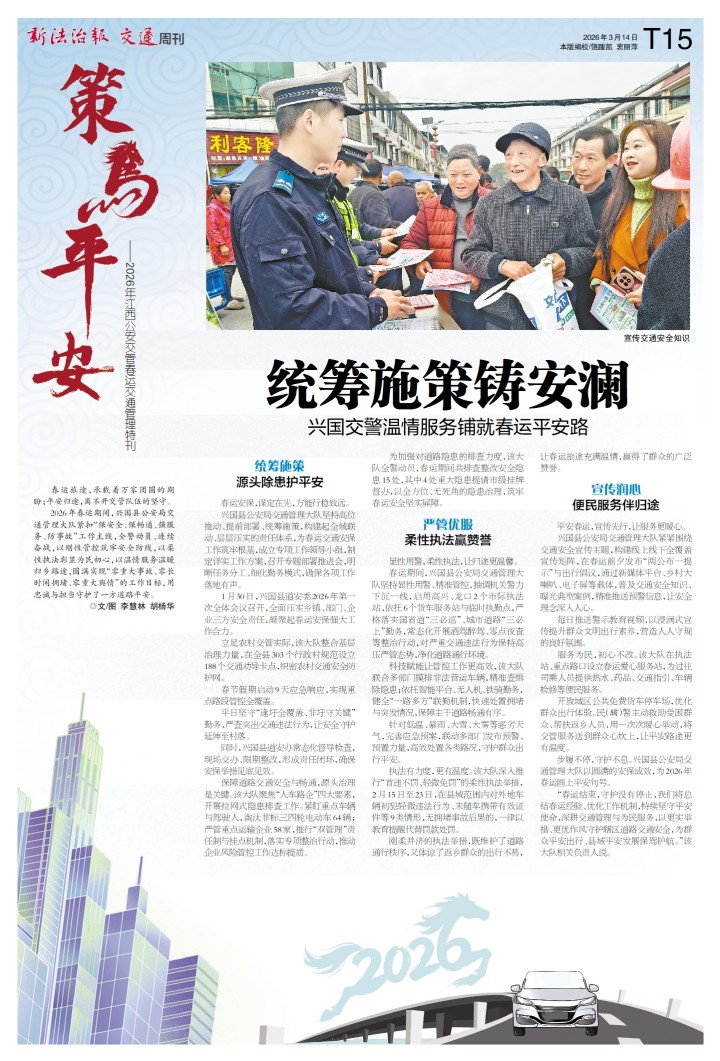 2026年春运期间,兴国县公安局交通管理大队紧扣“保安全、保畅通、强服务、防事故”工作主线,全警动员、连续奋战,以刚性管控筑牢安全防线,以柔性执法彰显为民初心,以温情服务温暖归乡路途,圆满实现“零重大事故、零长时间拥堵、零重大舆情”的工作目标,用忠诚与担当守护了一方道路平安。