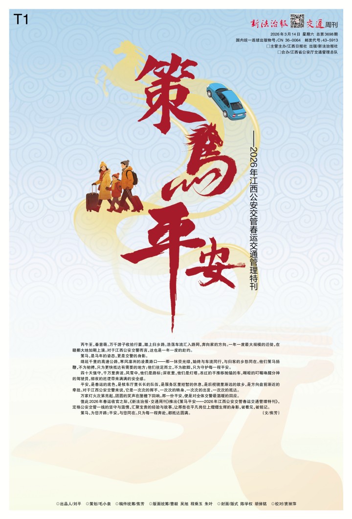 值此2026年春运收官之际,《新法治报·交通周刊》推出《策马平安——2026年江西公安交管春运交通管理特刊》,定格公安交管一线的坚守与温情,汇聚宝贵的经验与故事,让那些在平凡岗位上熠熠生辉的身影,被看见,被铭记。