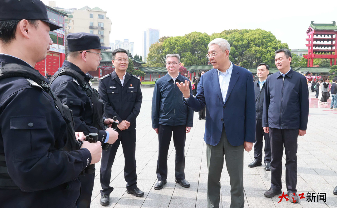 春和景明,游人如织。在滕王阁景区东门外,尹弘察看周边道路管控、环境整治等情况,看望慰问一线执勤特警,要求持续推动滕王阁景区及周边街区环境整治,做好古色文章,彰显文化底蕴。尹弘实地检查景区人流秩序维护、安保措施落实情况,通过中控室监控察看景区秩序,走进微型消防站检查器材设施,强调要增强主动服务意识,健全景区流量控制机制,加强客流现场引导、合理调控人流密度,备足应急机动力量,加强消防设施维护,不断提升旅游服务质量,让游客玩得尽兴、游得安全。