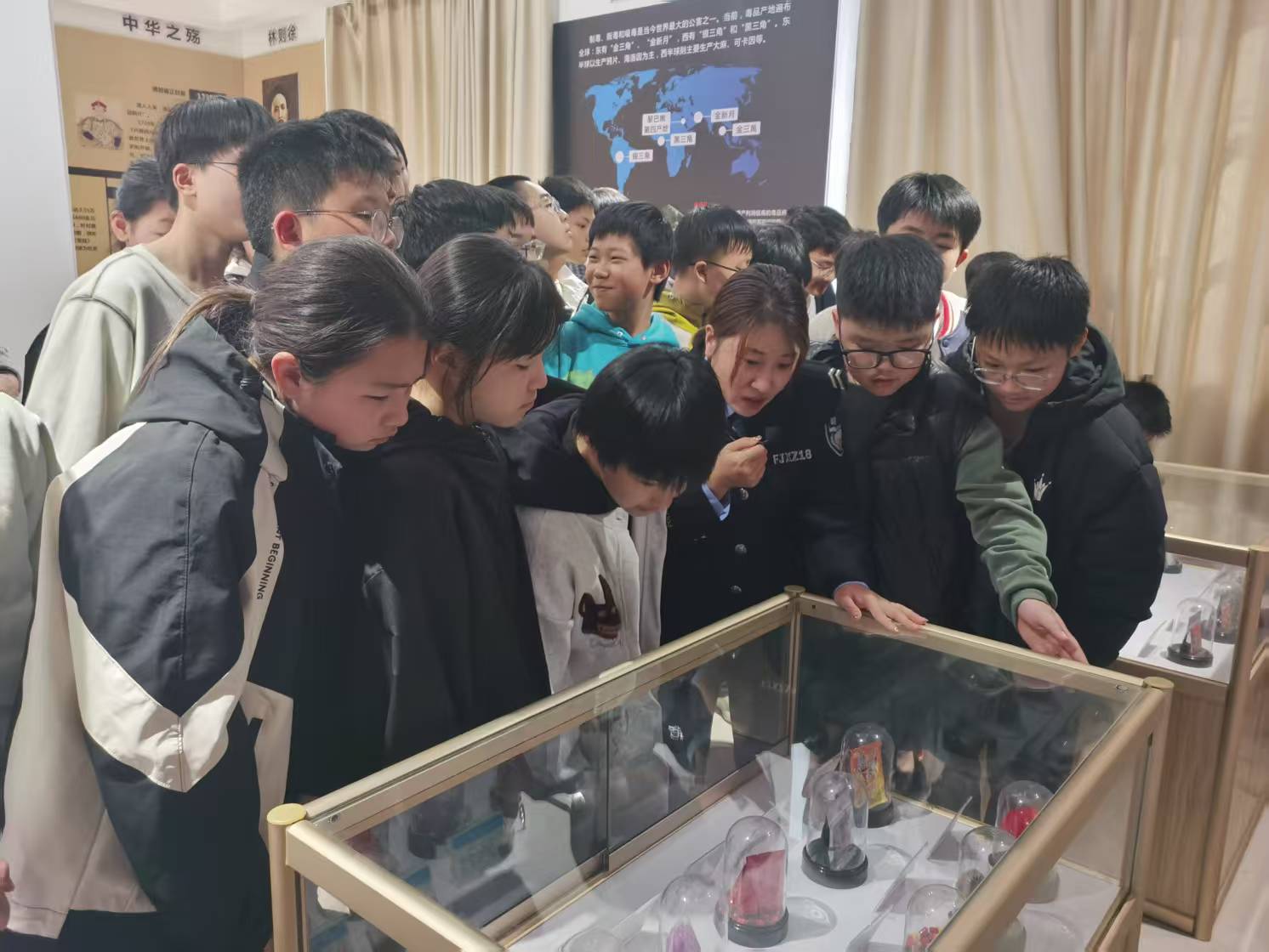禁毒宣传长廊里的展板和仿真毒品模型吸引了大家驻足观看,讲解员重点科普了新型毒品的伪装和涉毒人员诱骗手段。随后,讲解员操控无人机升空,用机身喇叭循环播报禁毒知识、实时传输数公里外的高清画面,让同学们感受科技禁毒的力量。在课堂上,民警结合青少年的认知特点普及禁毒知识,重点强调新型毒品隐蔽性和欺骗性,提醒学生不进入复杂娱乐场所、不接受陌生人零食饮料、不随意结交闲散人员,从源头杜绝涉毒风险。