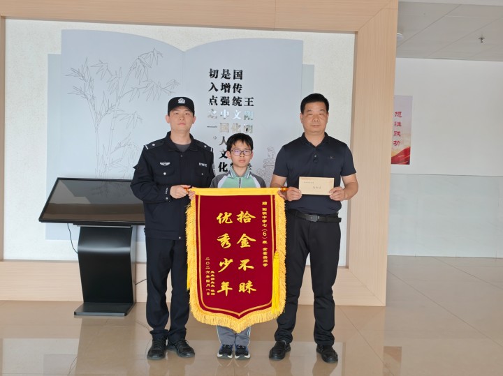 “警察叔叔,我在路边捡到一个钱包,里面有5000多元现金和一些银行卡……”黄景奕将钱包交到民警手中,并说明了捡到钱包的地点和经过。民警获悉后,对黄景奕拾金不昧的行为给予表扬,而后联系上了失主郭先生。事后,郭先生为表感谢,寄来两面锦旗和两封感谢信,分别赠予横水派出所和黄景奕。