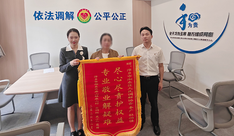 近日,萍乡市湘东区麻山镇居民吴女士专程来到萍乡市湘东区人民调解协会,将一面印有“尽心尽责护权益 专业敬业解疑难”的锦旗交到调解员手中。红绸金字映照着她舒展的眉头,这起历时数月的劳动纠纷,终于画上圆满句号。